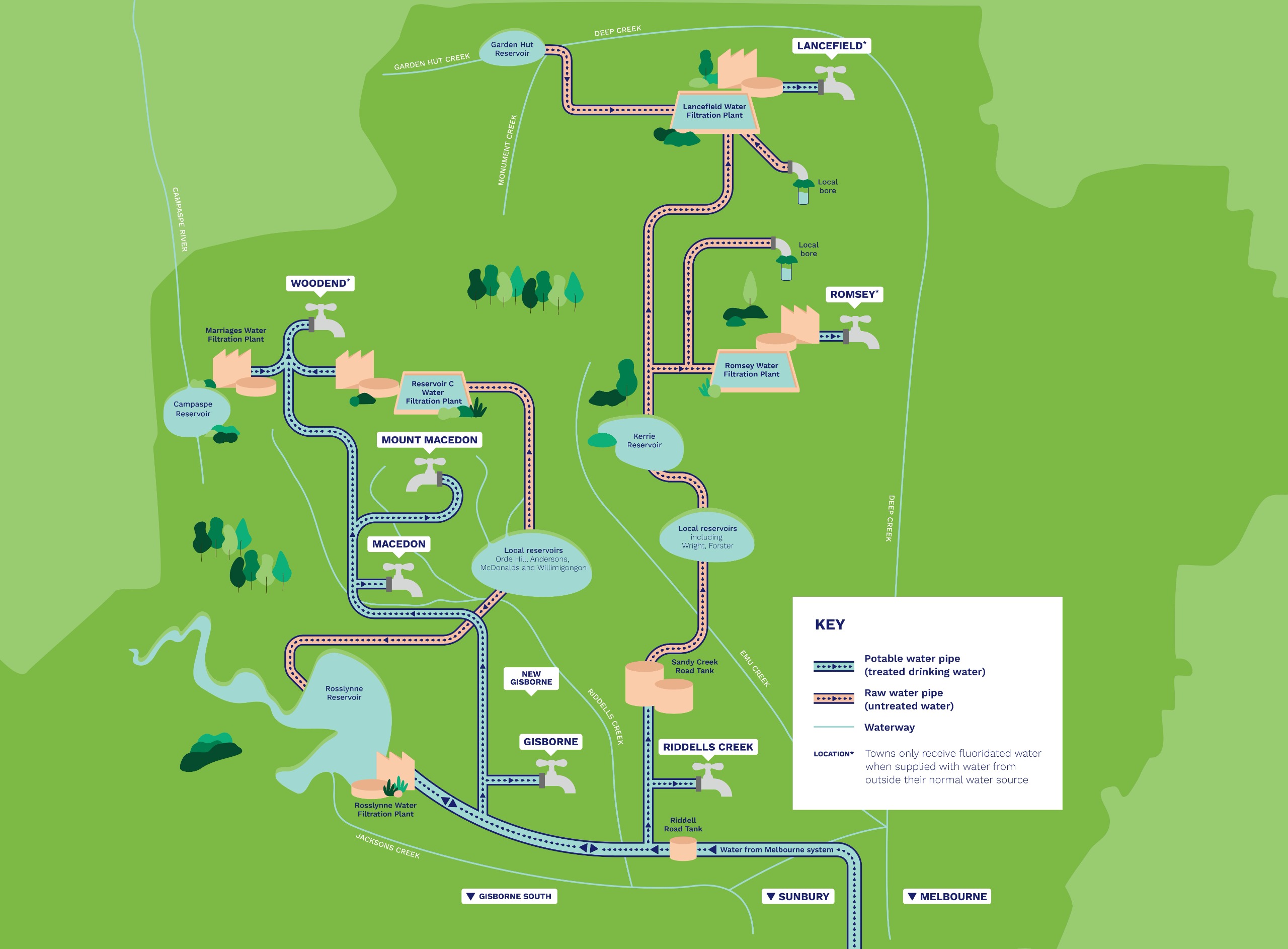 Macedon Ranges is supplied by multiple water sources which helps to support a reliable supply. Drinking water in the Macedon Ranges comes from local creeks, reservoirs and groundwater, supplemented by the Melbourne Water supply.